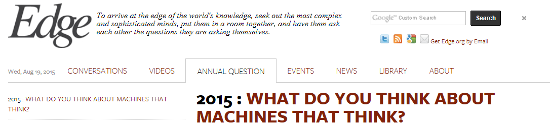 Cada año lanza una pregunta a la que van respondiendo destacados intelectuales, miembros de universidades e instituciones científicas, del mundo de los negocios, de las artes y de la cultura en general. Al final del curso John Brockman, un prestigioso empresario cultural norteamericano (editor y creador de la web) hace una compilación de las respuestas más interesantes y las edita en un libro. La pregunta lanzada al mundo en 2015 es ¿Qué piensas sobre las máquinas que piensan?