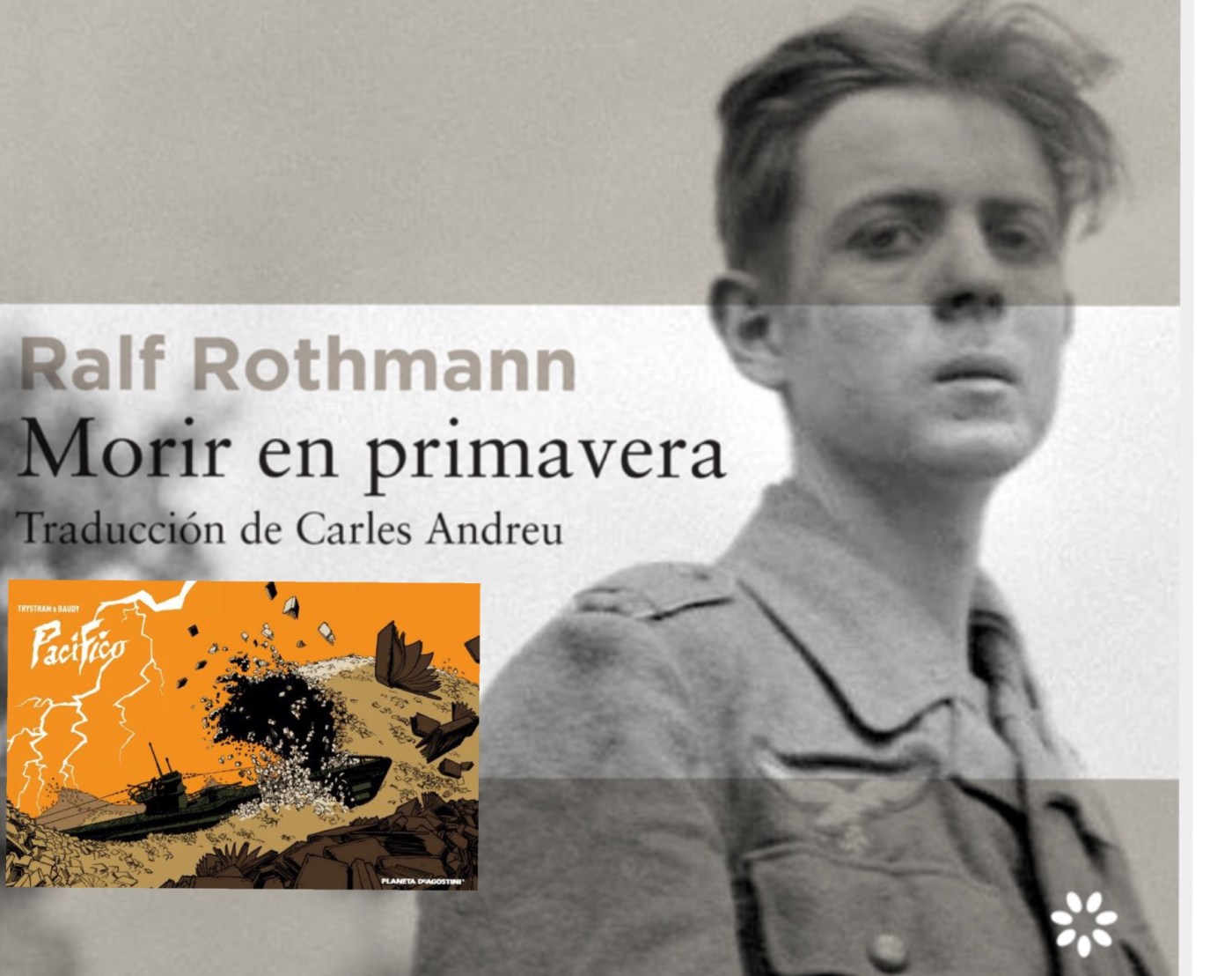 Morir en primavera es una novela del escritor alemán Ralf Rothman. Pacífico es un cómic de Martin Trystram y Romain Baudy . Las historias que cuentan están escenificadas en la Segunda Guerra Mundial y ambas desde el lado alemán. Dos formatos diferentes, pero que son un canto antibélico de gran belleza, especialmente la novela de Rothman. Morir en primavera cuenta la historia de dos adolescentes reclutados, casi casualmente, cuando apenas quedan meses para la capitulación alemana. Walter y su amigo Fiete, que hasta entonces habían estado viviendo trabajando en una granja, dedicados a sus quehaceres cotidianos y a rutinas ajenas a la dura realidad de la guerra, son enviados con las SS al frente de Hungría. A partir de ese momento Rothman construye muy sutilmente dos narraciones paralelas. Por un lado irá detallando cómo se desmorona la maquinaria de guerra que sometió a todo un continente, la desmoralización de las tropas, el anquilosamiento de los impotentes mandos y la cada vez más acuciante e inevitable sensación de sálvase quién pueda entre los soldados. Los en otro tiempo bravucones y orgullosos soldados del régimen convertidos en personas corrientes que tienen miedo a morir o a caer prisioneros. Por otro lado la historia principal, la tragedia del protagonista, Walter, envuelto sin quererlo ni entenderlo en una carrera hacía ninguna parte, sin redención posible, ¡cómo tenerla siendo del bando nazi!Las guerras las luchan y padecen muchos por el designio de sólo unos pocos. Los bandos se construyen acumulando tanto a los que se pliegan a las órdenes de los mandatarios como los que se rebelan pero acatan. Una vez en el bando, no hay distinción. Matar para que no te maten. Rojos en un lado, nazis exterminadores en el otro. La paleta de sentimientos y caracteres de los que conforman los bandos se diluye bajo el cartel que a cada uno le cuelga. Es por eso que la historia de Rothman resulta tan emotiva, porque lo hace desde el punto de vista alemán (con todo las connotaciones que eso conlleva, porque no todos los alemanes eran nazis exterminadores) y construye una historia real con protagonistas que acatan pero no entienden el por qué. Walter pasa de la noche a la mañana de ordeñar vacas, trabajar para ganarse la vida e intentar ligar con la chica que le gusta, a luchar en el frente. La prosa de Rothman es tan limpia y contenida que por momentos el lector no parece estar sumergido en una contienda bélica, distraído en el costumbrismo de los adolescentes. El autor no se recrea en la crueldad de la guerra, salvo en momentos muy puntuales para envolver adecuadamente las circunstancias de los protagonistas, pero termina girando su pacifismo cuando expone a Walter y Fiete a la más dura de las tragedias. Walter sólo disparará un tiro en la contienda. Lo hará en un pelotón de fusilamiento, con su amigo acusado de desertor frente al mismo. Los parajes morales a los que se empuja a los protagonistas son caldo de cultivo para la reflexión, espacios de conflicto emocional que arrinconan incluso a los propios de la violencia de una guerra. Los dilemas que atormentarán a Water el resto de su vida son trasladados por el autor con toda su crudeza, con un realismo lírico realmente impactante. El sentimiento de culpa del inocente se relata magistralmente para determinar este bello relato antibélico. La inocencia, la casualidad del destino, la libertad, el deber y la culpa son mezclados a la perfección, donde la prosa sin excesos es tan deliciosa como directa al estómago cuando toca.